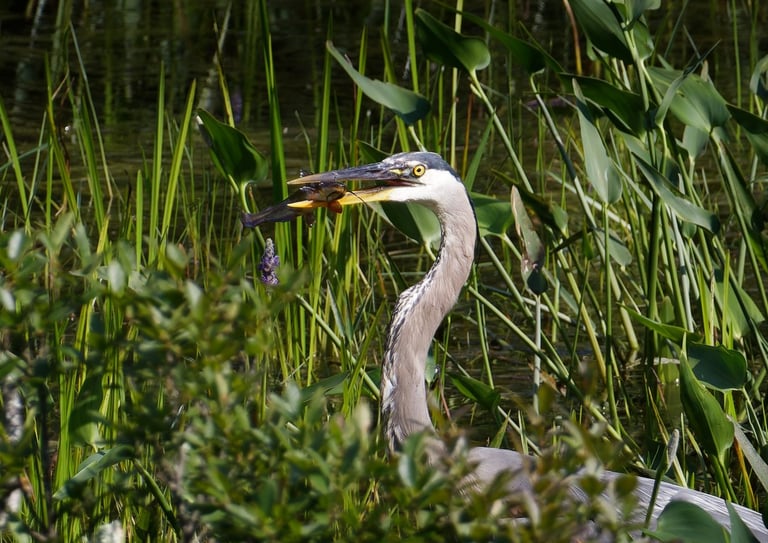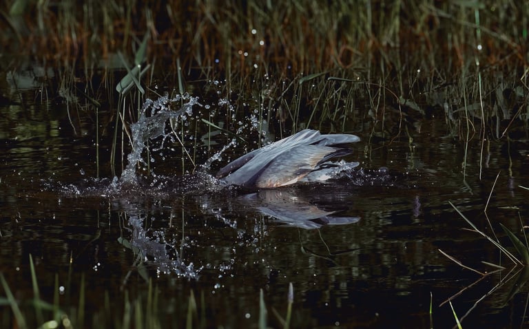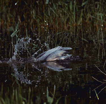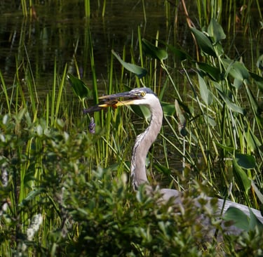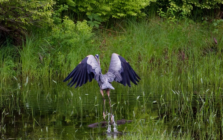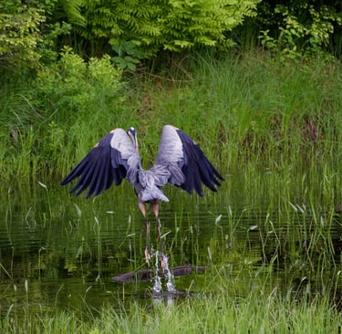 At dusk, carrying more than I could release, I sat motionless at my living room window. Camera in hand. Behind my small apartment there lies a bubbling brook. Just past the wake of the water is a small, marshy area. Pale gold skimmed the water; mist clung to reeds. I almost missed her getting lost in the beauty of such a landscape. A great blue heron, still as stone in the shallows, looking at something I can’t see. Air and water held together by silence, left me breathless. Her single golden eye glinted. I softened my gaze and tightened the focus to get a better shot. Something in her patience spoke to the storm in my chest. Something, I wanted to be able to look back on forever. Herons live where elements meet water, earth, air. Wading for long minutes, not idle but vividly present, waiting for the right moment to strike. I envy her self-control. So, I waited, too. We shared the quiet, both of us in the muddy margin between solid ground and deep water. More than a fitting metaphor for my life between a traumatic past and an uncertain future. The marsh’s rhythm slowed my thoughts. We stayed like that for what felt like a small eternity until a sudden ripple in the water broke the spell. A slimy catfish fish, darting near her feet. In a blink, the heron struck. The blur of blue-gray motion and lethal grace. I could see her spear-like beak impaled the fish with one clean stab. It looked like a slimy catfish, ready for the picking. Gasping quietly at the speed and accuracy, I wonder how she even saw the fish in the first place. Then, just as quickly as she swallowed her catch and resumed her statue-like pose, ripples fading around her. It happened in an instant, but it wasn’t luck. This results from results of hours of attention distilled into one perfect action. I sat up, marveling at how present and deliberate she was. It made me reflect on my own behavior. How often had I lashed out blindly, or made rash choices in the grip of anger and fear? The answer is something I hold guilt over tightly. cPTSD can trigger internal fight-or-flight responses at the slightest provocation. Leading to external behaviors. Anger cooled from wildfire to ember. The lesson arrived without words; be here, patience, observation, then precise response. You are all right at this moment. She was alone but not lonelier, her solitude a choice and power. She did not deny her predatory nature; when the time was right, she acted swiftly and effectively, while she also didn’t waste energy flailing at every minor ripple. Not everything is an enemy or a crisis. This is the hard truth I needed to learn in my trauma recovery. As sunlight burned away, and the mist cleared, she spread her wide wings and lifted on a low whoosh. She crossed the pond toward the darkening sky, silhouette of self-trust.